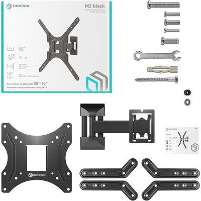 Настенный наклонно-поворотный кронштейн ONKRON M2 предназначен для ТВ с диагональю от 26 до 65 дюймов (66-165,1 см).