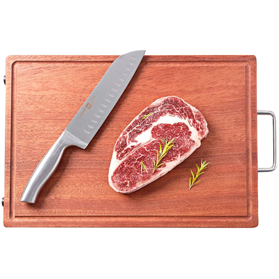 Выбранный материал (древесина сапеле) идеально подходит для разделочной доски, он прочный и надежный, сделан из цельного куска дерева, причем из каждого ствола можно изготовить лишь две разделочных доски, что делает задачу по производству оной еще более ответственной. Обе стороны доски годятся для использования, с одной из сторон есть канавка. Доска лишена трещин и зазоров, в которые могла бы попасть грязь. Соответственно, ее легко мыть, и она безопасна для здоровья. Для долговечности доска покрыта органическим защитным маслом, дабы грязь не могла попасть в поры, присутствующие в любой древесине.