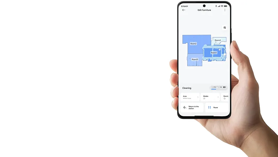 Для максимальной эффективности в любых ситуациях в H50 реализованы четыре специализированных режима уборки, которые позволяют гибко адаптировать работу робота под ваши требования. Вы можете выбрать режим предварительной сухой очистки перед мытьем пола, чтобы избежать появления грязных разводов, или использовать комбинированный формат для быстрой поддержки чистоты. Система позволяет индивидуально настраивать интенсивность всасывания и уровень подачи воды для каждой комнаты, обеспечивая рациональный подход к уборке. Xiaomi Robot Vacuum H50 понимает, что разные зоны требуют разного ухода, и предлагает именно ту стратегию, которая обеспечит лучший результат.