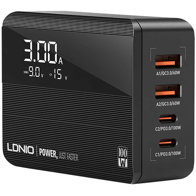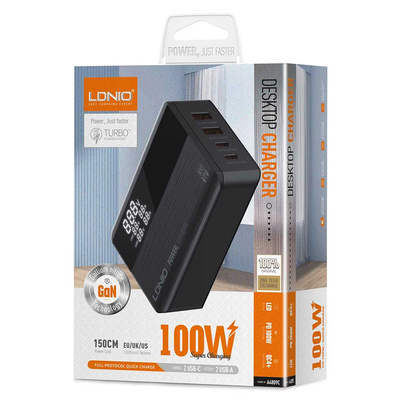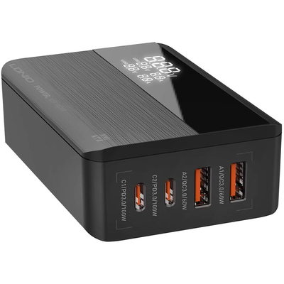 LDNIO A4809C GaN 100W PD Super desktop charger - настольное сетевое зарядное устройство, которое позволяет заряжать до 4 устройств одновременно в кратчайшие сроки. Настольная зарядка A4809C отличается четырьмя портами: Type-C1 + Type-C2 + USB-A1 + USB-A2 и использует технологию GaN для повышенной производительности.